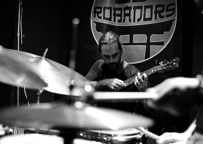 Poco a poco fueron tomando forma. El bajista frotando un vaso de cerveza en el mástil, usando sus pedales… golpes y manos arrastradas por el teclado; el baterista golpeando con criterio, pero sin piedad; y Naná haciendo crecer el sonido de su instrumento (un sonido que no dejó indiferente a nadie) hasta que explotó como un volcán. Escupiendo infierno entre sus dientes.